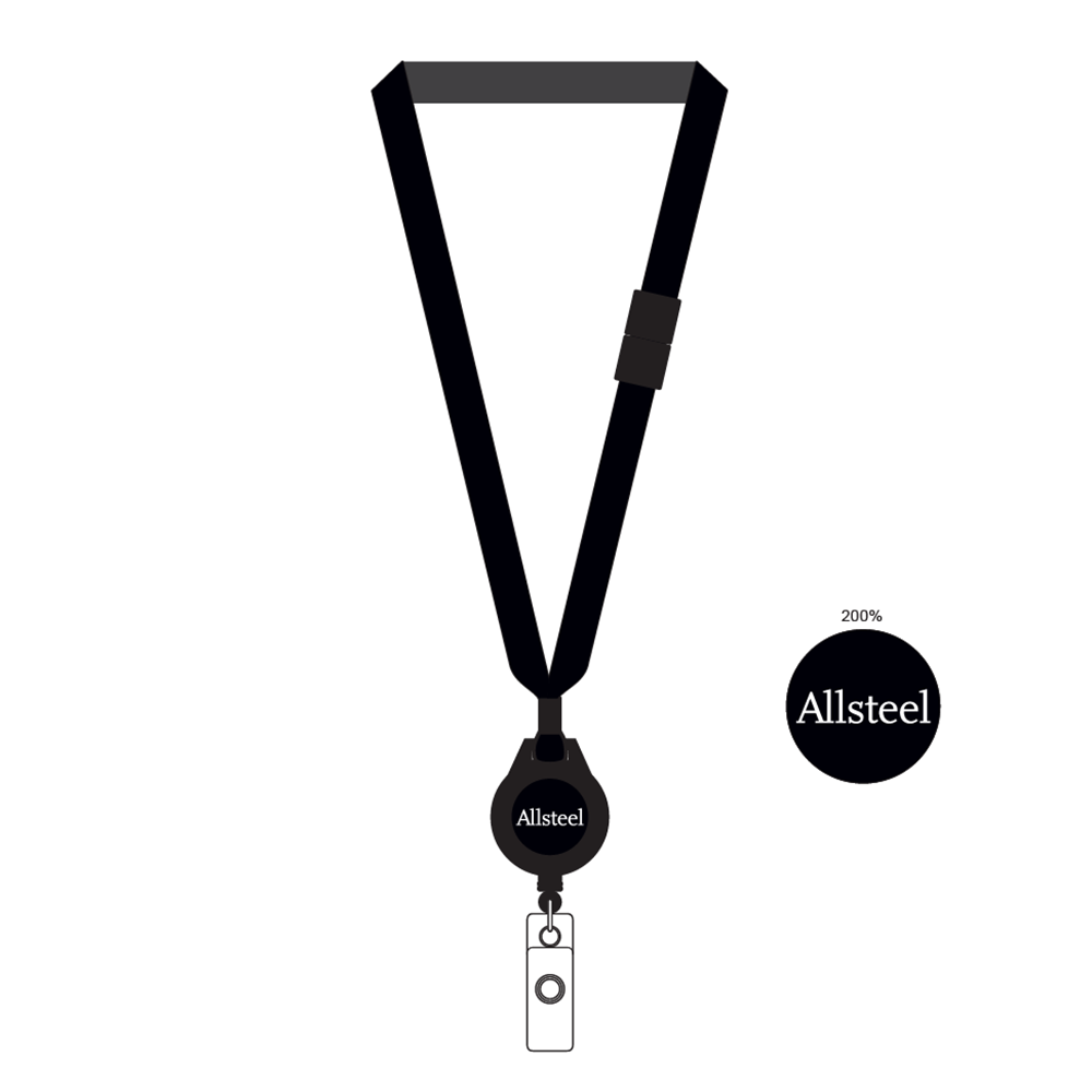 3/4" lanyard with retractable badge holder on the end. The vinyl pouch measures 4" x 3". The Allsteel logo is featured on the retractable portion.
